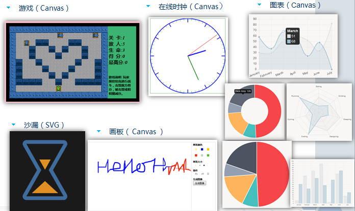 •视频/音频 、画布 & SVG 、可编辑内容 & 拖放、Web存储、Web Worker 、服务器发送事件、表单增强功能、语义化标记、更多HTML5标准