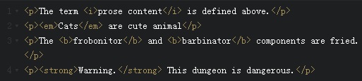 // 分类学名称 <p>The <i class="taxonomy">Felis silvestris catus</i> is cute.</p> // 术语 <p>The term <i>prose content</i> is defined above.</p> // 外语习语 <p>There is a certain <i lang="fr">je ne sais quoi</i> in the air.</p>