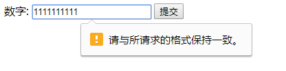 大家可以尝试下, 在输入非11位的数字, 都会报错, 这就是 pattern 的功劳. 但是不知道大家发现了一个蛋疼的现象没? 就是如果咱们使用 pattern 的方式去验证表单, 在验证失败时, 它的提示都是 请与所请求的格式保持一致 , 我的天, 我们的用户怎么知道所请求的格式是什么鬼, 总不能让他们去看源码吧, 要真这样, 我们连页面都不用写了, 直接让他们把钱给我们得了, 开个玩笑~