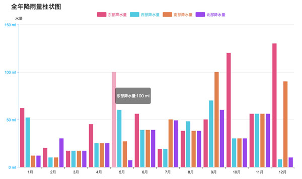 首先绘制标题,接着XY轴,然后遍历分组数据series,里面有复杂的计算,然后绘制XY轴的刻度,绘制分组标签,最后是绘制数据。数据项series中是分组数据,它跟X轴的xAxis.data一一对应。每个项可以自定义名称和颜色,没有指定的话,名称赋予nunamed和自动生成颜色。这里还用legend属性记录下了标签列表信息,因为后续鼠标点击判断是否点中用的上。