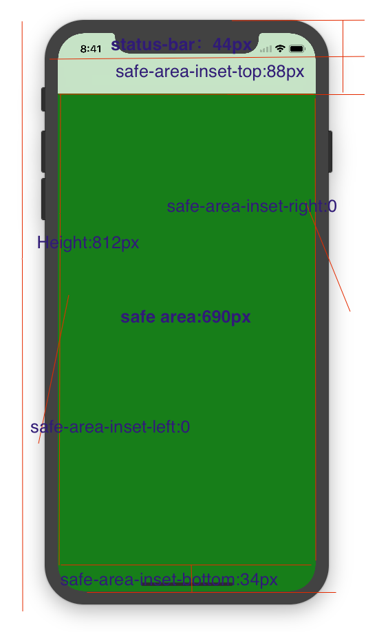 但是用了之后你会发现,区域是开放了,但是内容(常为导航栏)却因为“齐刘海”而被遮挡住了部分内容,并且,发现原本设置的100%的高度并没有占用全部高度空间,怎么办?
