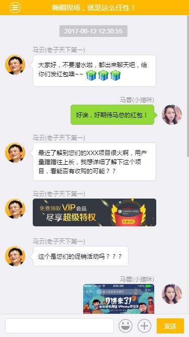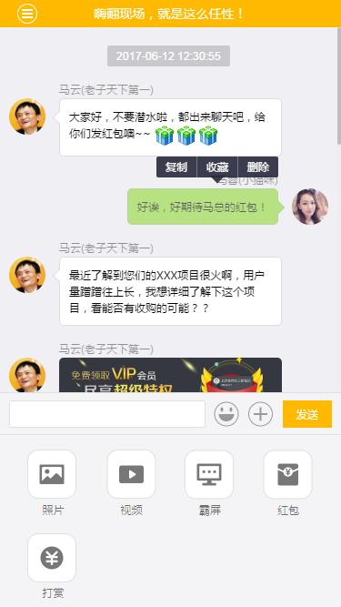 这几天使用H5开发了一个仿微信聊天前端界面,尤其微信底部编辑器那块处理的很好,使用HTML5来开发,虽说功能效果并没有微信那么全,但是也相当不错了,可以发送消息、表情,发送的消息自动回滚定位到底部,另外可以对消息、图片、视频有不同的右键处理提示,还有打赏、占屏等操作。