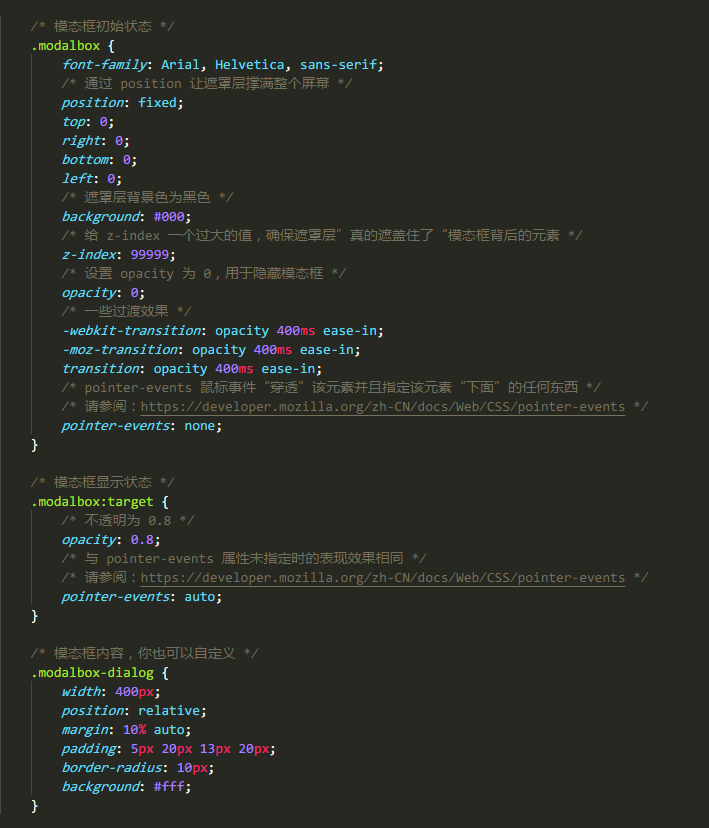 可能你并不想看我下面的一堆冗长的说明,想直接查看源码或者一个在线示例。下面的链接,是我使用 CSS3 的 transition(过渡),opacity(不透明度),pointer-event(指针事件)等属性创建的一个功能型模态框。