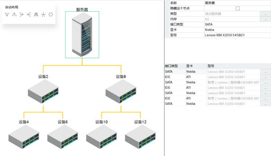 最后说一下整个界面节点的排布,HT 中的 autolayout 自动布局组件,即根据节点和连线关系,提供多种类型算法进行自动排布节点位置。 自动布局常用于图元较多,或连接关系教复杂时,不易于人工拖拽摆放的场景。我把各个布局方式通过按钮的方式呈现出来了,点击对应的按钮,布局方式就会根据按下的按钮设置的排布方式来自动布局: