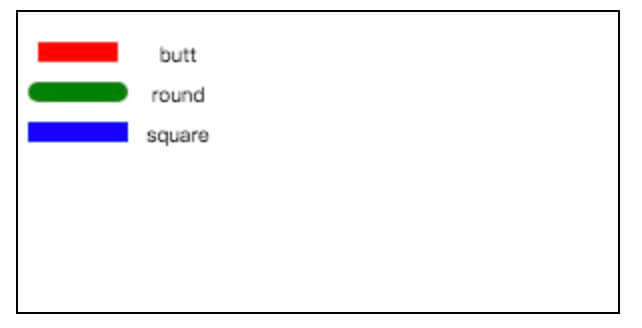 从上图结果可以看出,再将lineCap设置为round 和square时会在原线段的两端加上一定长度的端点,只不过round是圆弧样式,square是矩形样式。需要注意的一点是,在canvas绘制上下文中同一时刻只能存在一个当前路径,为了绘制不同的线段,必须在每次绘制之前调用beginPath()来清空当前路线,开始新的路径。