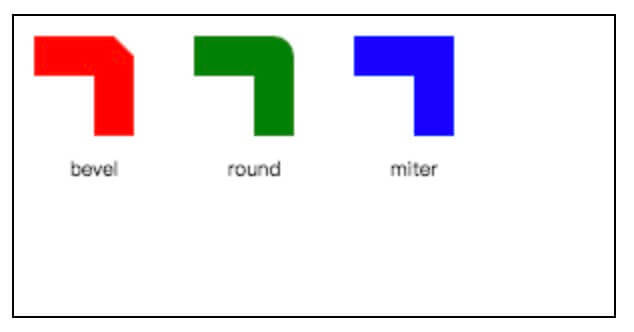 可以看到,三种lineJoin在处理两条线段的焦点处的不同。其中,在设置lineJoin="miter"时,通过设置miterLimit属性可以设置斜接线的长度与二分之一线宽的最大比值,当超过这个比值时,则lineJoin会采用bevel方式。