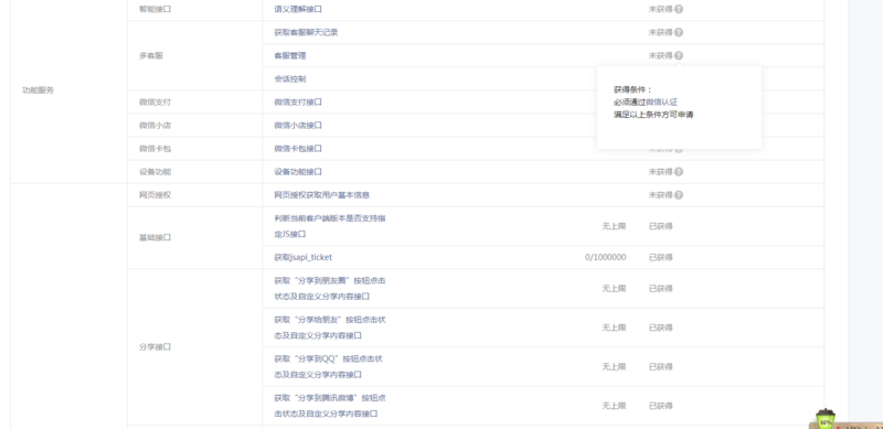 先查看 微信公众平台-开发-接口权限 发现没权限的都提示未获得,然后去进行微信认证,我这个分享接口提示已获得了呀。上面说过什么?微信的文档可以去后面查看一般都有说明。就是下面这句话,那么问题就来了,个人号是没法做认证的。