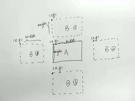 检测A,B是否发生重叠,在讨论是否发生重叠时我们可以先看看没有重叠的四种情况,如下图: