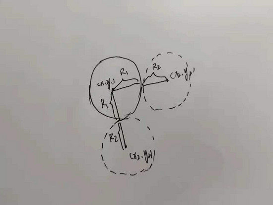 圆形间碰撞检测可以简单地通过两圆心间距离与两圆半径之和的比较做判断,当两圆心距离小于两圆半径之和时则发生碰撞。