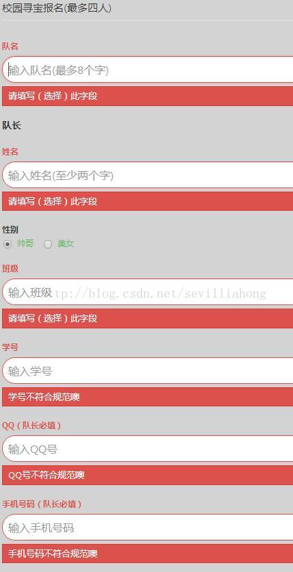 本人是小白,以前做表单验证都是在提交之前用js检查一下参数,但这个项目中参数较多,而且同一字段的校验方式不同(队长QQ、手机必填而队员不用),若再用之前的方法工作量显然较大,有没有更好的方法呢?这时候我看到了amazeUI的js验证框架,交互效果不错。