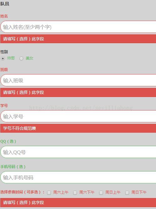 这里的验证可以根据需求添加到对应字段上,如队长的QQ、手机号码添加验证而队员的不用添加。