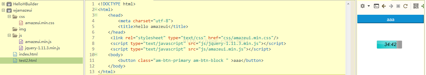 <!DOCTYPE html> <html> <head> <meta charset="utf-8"> <title>hello amazeui</title> </head> <link rel="stylesheet" type="text/css" href="css/amazeui.min.css"/> <script type="text/javascript" src="js/jquery-1.11.3.min.js"></script> <script type="text/javascript" src="js/amazeui.min.js"></script> <body> <button class="am-btn-primary am-btn-block " >aaa</button> </body> </html>