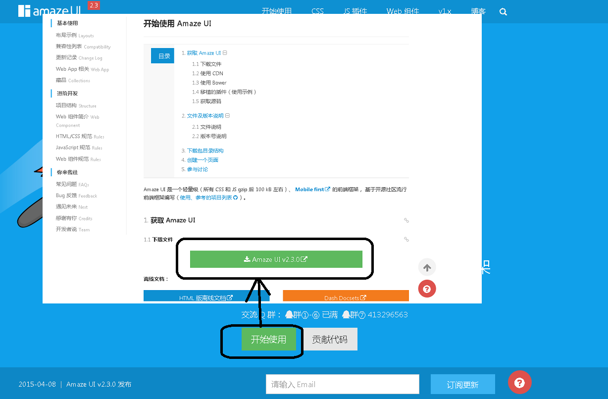 1、这东西直接在AmazeUI的官网(点击打开链接)中下载,打开官网之后,选择“开始使用”->然后在“获取 Amaze UI”一栏中“Amaze UI v2.3.0”