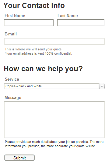 部分. 这是一个提供印刷服务的表单, 很有效的利用了描述来说明表单的作用。