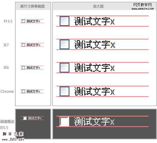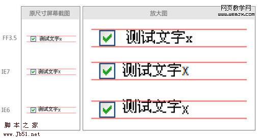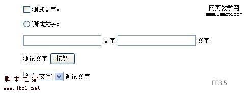 但是这对于中文来说,并不是一个好的结果。因为中文是方块字,并且相同字号的情况下,高度会比小写的x高出很多。所以,按照浏览器内置的方式,只用 vertical-align:middle是无论如何也无法对齐中文的(无论是只写中文,中文在前,英文在前,FF3.5都是按照小写x中心那种方法来对齐的)。但是回头再看看wheatlee的文章,他说这个小写x中心对齐的渲染方式,是对于“文字”来说的。那么,如果不是文字呢…?如果复选框后面跟的是一个行内元素,如label,而文字是写在它内部的,会是什么样呢?浏览器会不会将这个内联元素整体看作一个“块”,然后依照类似图片的规则进行渲染呢?如果那样,我们就达到目的了。