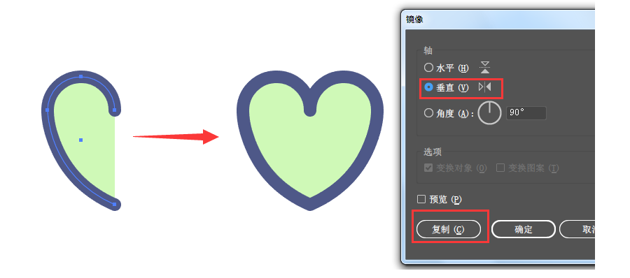 b:再利用钢笔工具,绘制如下,(注:视图-智能参考线勾选上),然后右键-变换-对称,复制一层,如下操作。