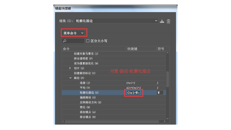 步骤2:这次的教程会经常用到轮廓化描边,所以我给它设置快捷键为ctrl+w,使得效率提高一倍,根据自己的习惯进行设置。编辑-键盘快捷键。