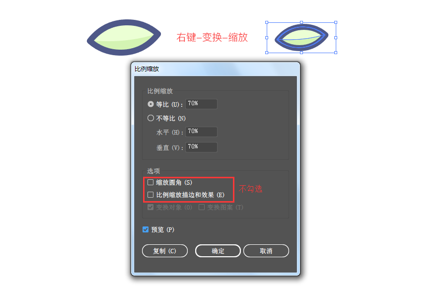 b:复制多个小叶片,进行变换。在制作四叶草叶片的时候,我们利用轮廓化描边,在后来进行放大或缩小,描边的大小也相应地发生变化,不信?可以量量看。那么接下来看看怎么处理这样的情况。