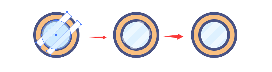 b:绘制镜框的高光,复制一层橙色图层并置为顶层,再画一层80*80px的圆,进行减去顶层,填充颜色#ffedd7。再画一个足够大的矩形,旋转一定角度,再进行减去顶层,调节圆角,调整图层顺序,最后编组,如下图。
