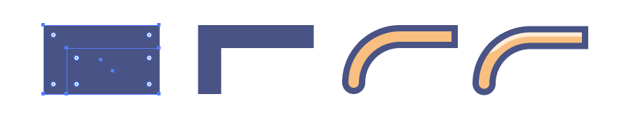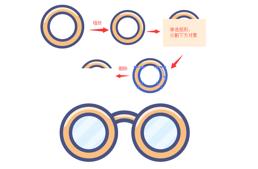 e:绘制眼镜架,画一个110*66px和一个88*44px的矩形,对齐到右下角,进行减去顶层,调节圆角,吸取颜色,高光部分就不演示了,试着绘制出来,如图。