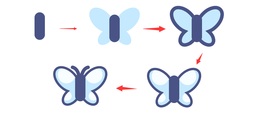 步骤3:绘制蝴蝶,画一个18*48的圆角矩形,填充颜色#495385,再画一个椭圆,填充颜色#c5e9ff,描边为6px,具体变换如下图。然后画几个圆作为斑点,填充颜色#f8fdff,剪贴进翅膀图层,再用钢笔工具绘制触角。