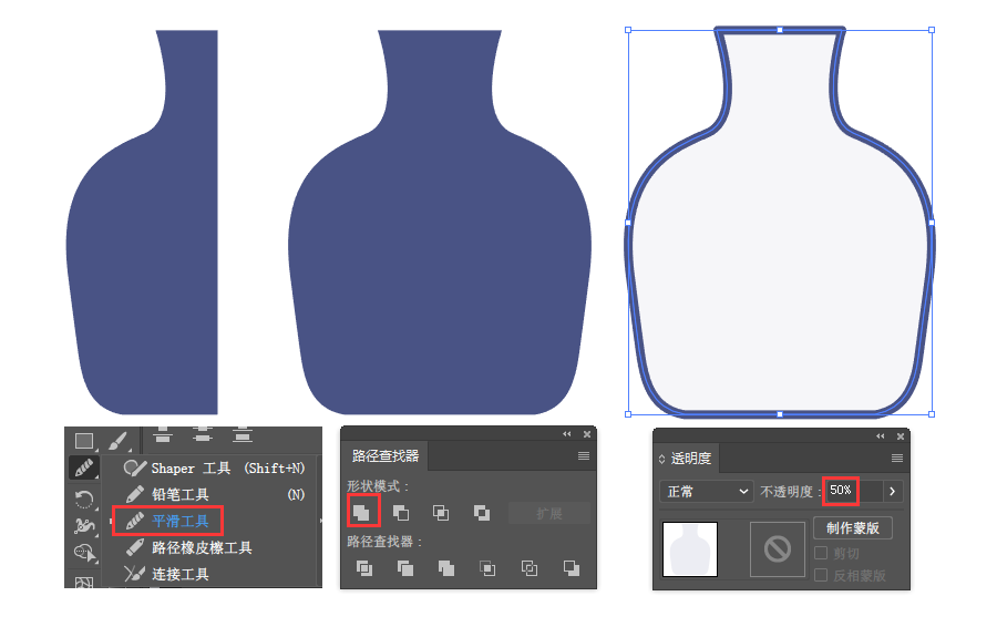 步骤1:利用钢笔工具绘制瓶子的一半,再变换-对称复制出另一半,进行联集,填充颜色#d9d9dd,描边为8px,填充颜色#495385,然后轮廓化描边,取消编组,选中填充图层设置不透明度为50%,(钢笔绘制时,如果感觉衔接地不是那么平滑,那么就用到平滑工具了,按住鼠标左键在锚点周围滑动,这样勾画的图形就会很平滑了)。