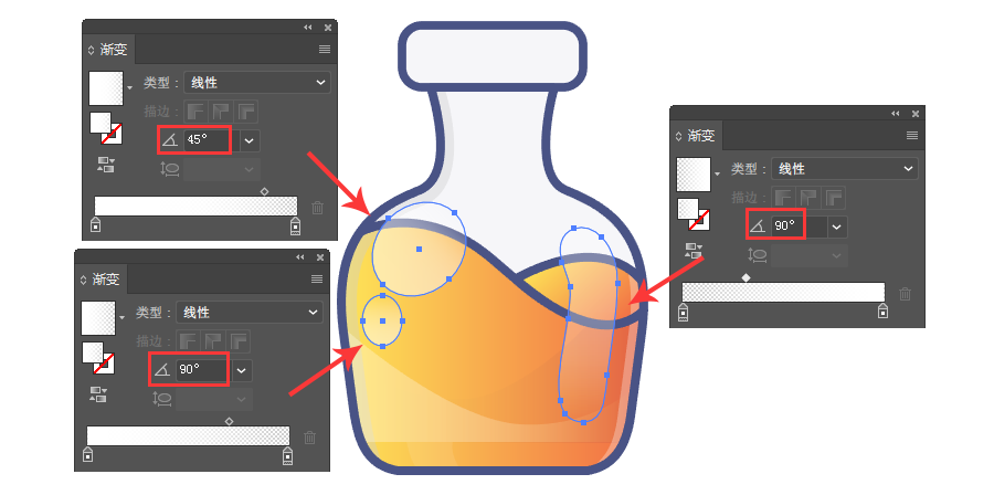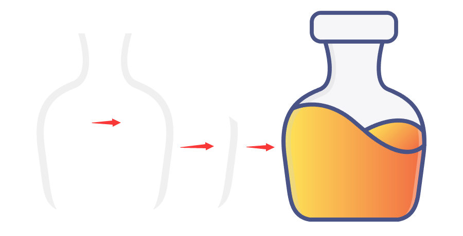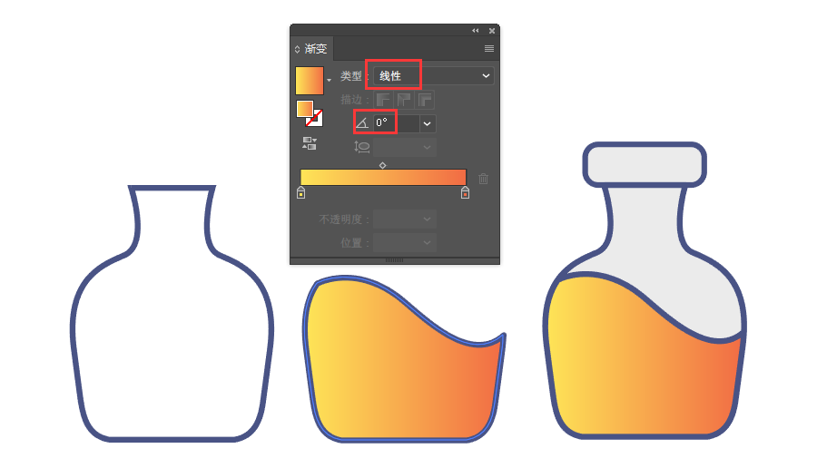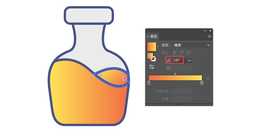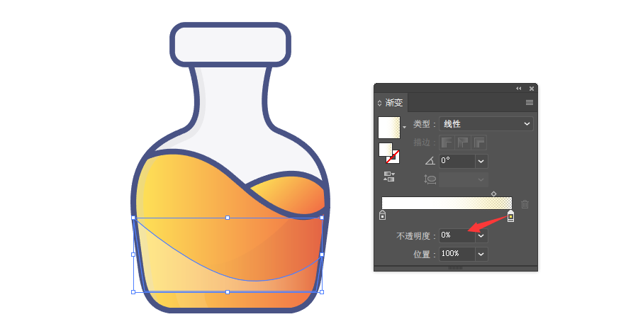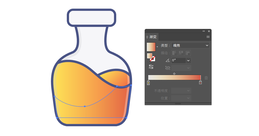 b:接下来绘制瓶中的液体,复制一层瓶子的填充图层改为描边,当然把不透明度值改回来,然后添加锚点,删掉多余部分,用钢笔工具连接绘制波浪线段,再给它添加渐变,色值为#fee557~#f16b44,接着轮廓化描边,留着有用,如图。