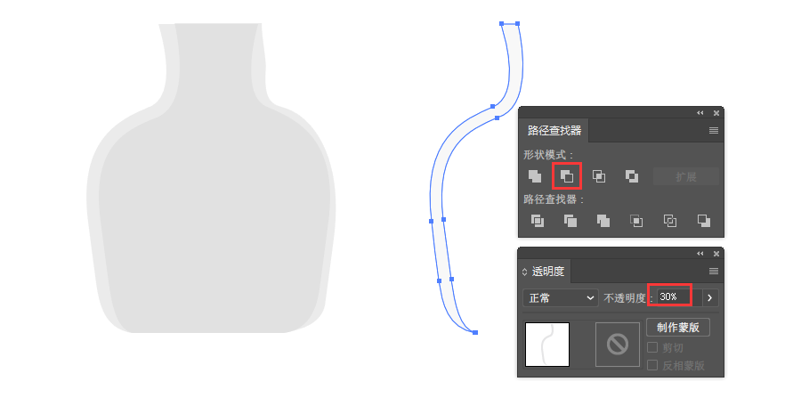 a:调节锚点,只要能弄出需要的图形,怎么弄都行,然后进行减去顶层,填充颜色#ccccce,降低不透明度为30%,如图。