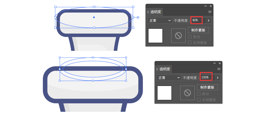 a:绘制瓶口,画一个164*56px的矩形,圆角18px,描边8px,填充颜色同上一步,投影轮廓化描边,取消编组,降低填充图层的不透明度为50%,与瓶子居中对齐,如图。