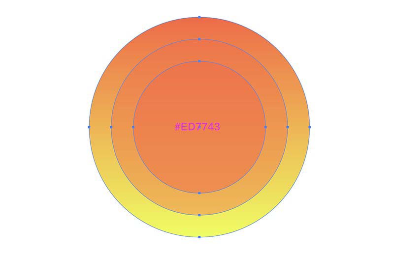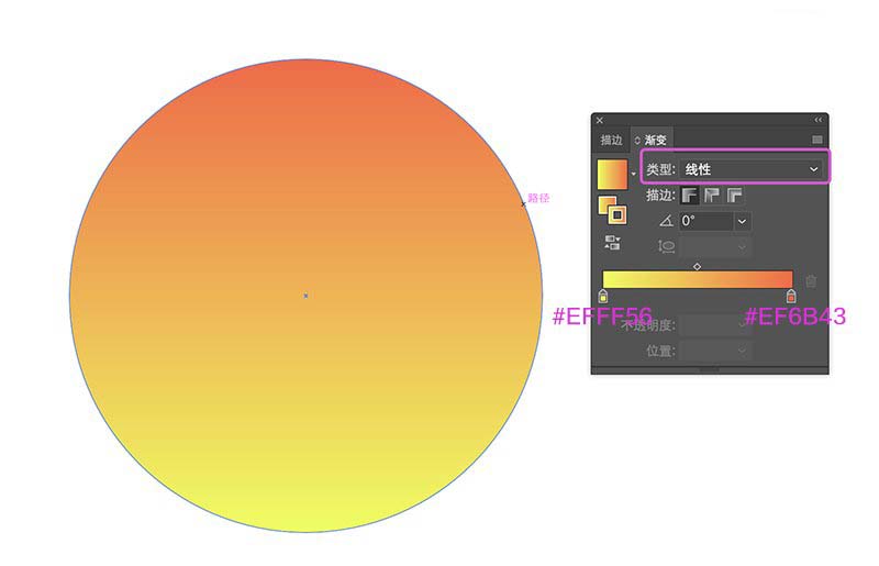 然后分别创建第一个圆480 x 480 px,线性渐变:#EFFF56—#EF6B43;90º 。