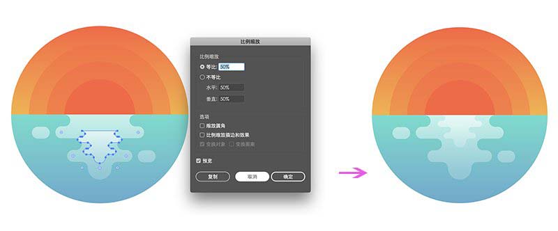 选中复合路径,复制一份(Control+C> Control+F),删掉多余形状,使用“ 缩放”工具(右键单击>“变换”>“缩放”>“等比”> 50%)进行缩小,移动如图所示位置。