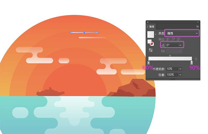 创建云朵和第二步绘制海面波纹的方法一样,不再赘述,参数:圆角矩形80 x 16px ,圆形16 x 16px。云朵:白色线性渐变(不透明度:20%—60%)