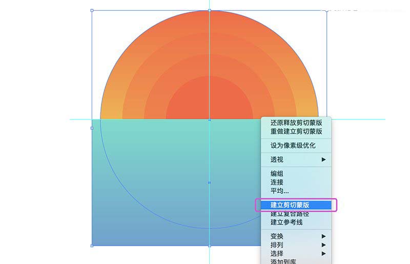 选中上面做好的最大的圆(Control+C Control+F),同时选中矩形,然后右键单击>建立剪贴蒙板。