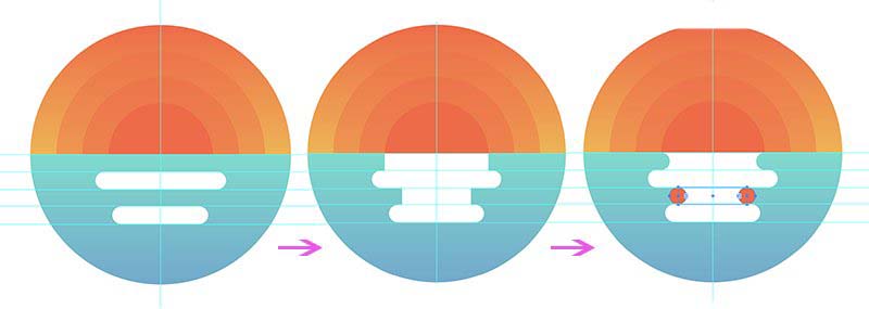 然后创建两个圆角矩形240 x 32 px、176 x 32px(#FFFFFF),居中对齐。再创建两个矩形192 x 32 px、128 x 32(#FFFFFF),位置如图所示。最后使用小圆32 x 32px,使用路径查找器作出如下图波浪形状。