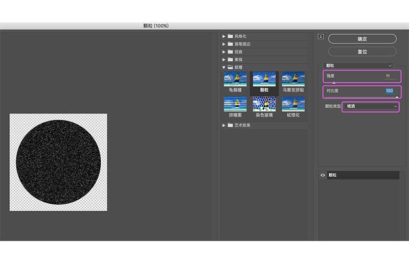 创建纹理:选中背景大圆复制粘贴(Control+C Control+F)#000000。选择效果>纹理>颗粒,设置它的强度11,对比度100,喷洒。