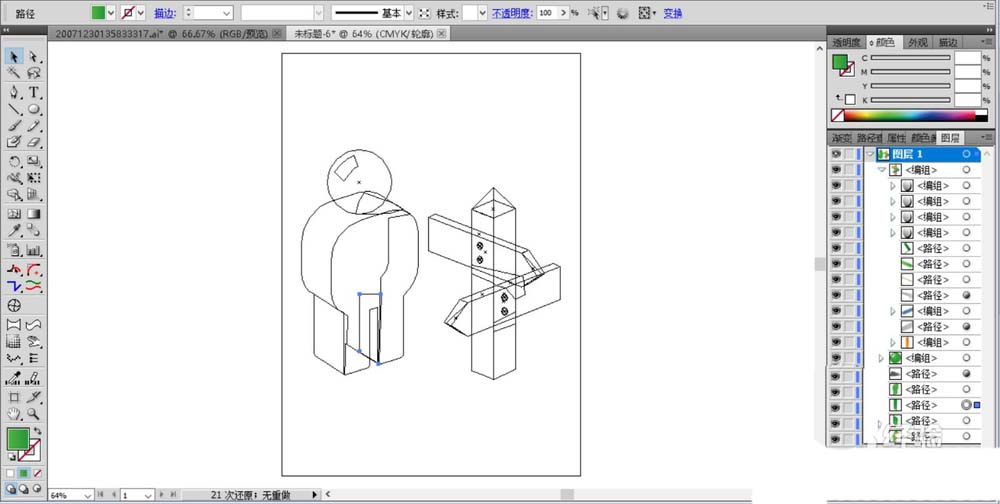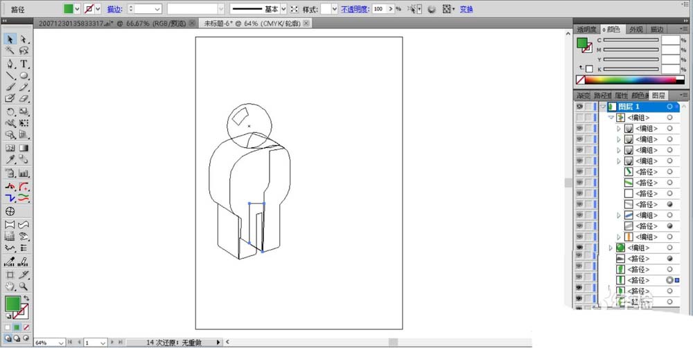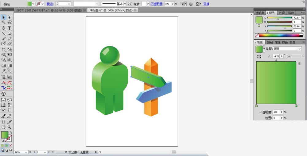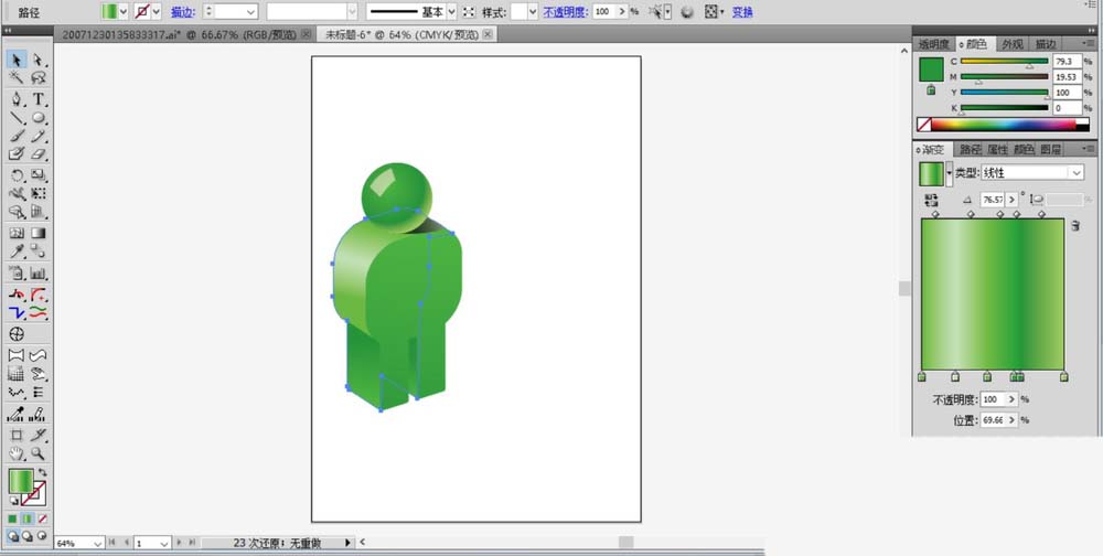 4、用绿色的渐变填充人的头部,人的身体,用白色填充高光路径并设置成透明度为30%左右。
