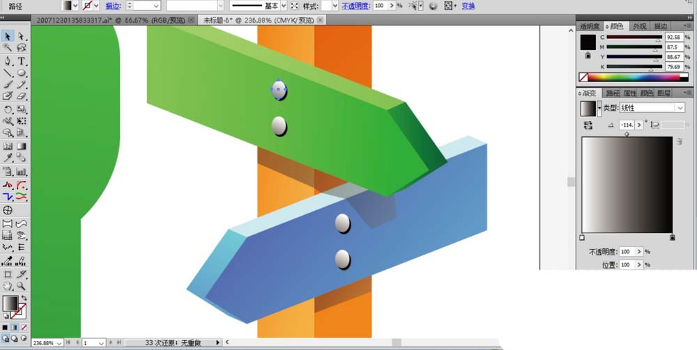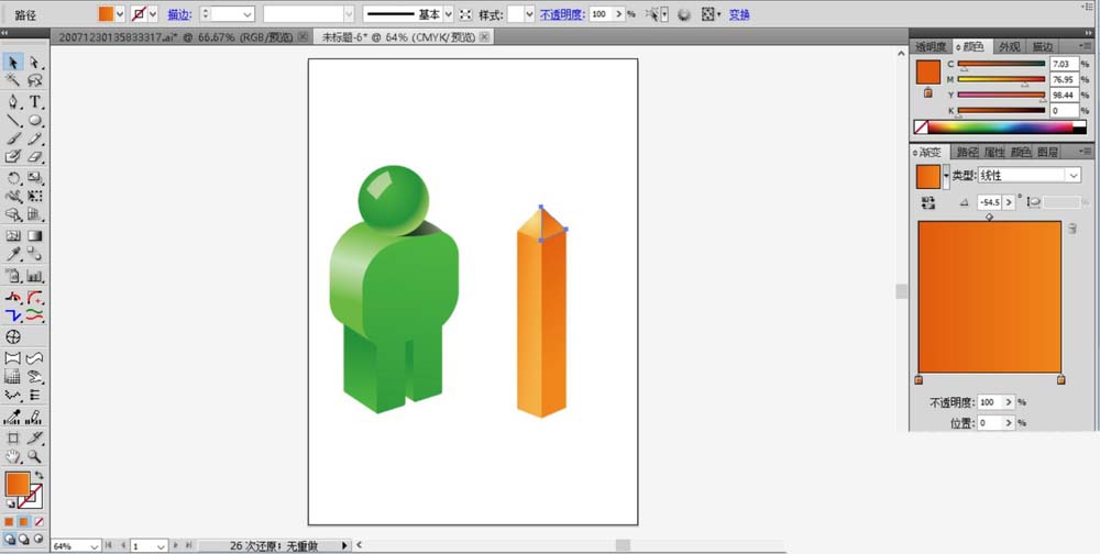 5、用橙色的渐变填充支架,各个侧面填充出明暗的变化。让暗光区域在右侧。
