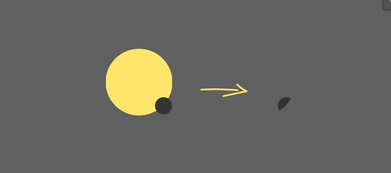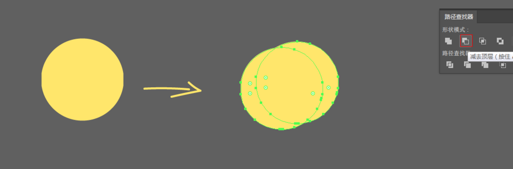 1、画一个圆,颜色为黄色,按住大概移动到如下位置,减去顶层之后得到一个月牙形状。
