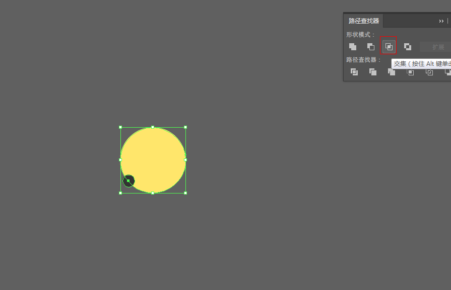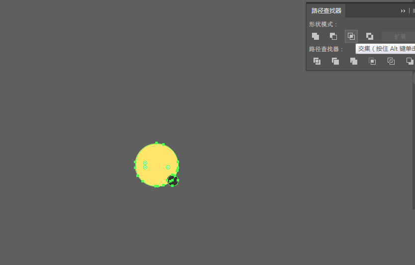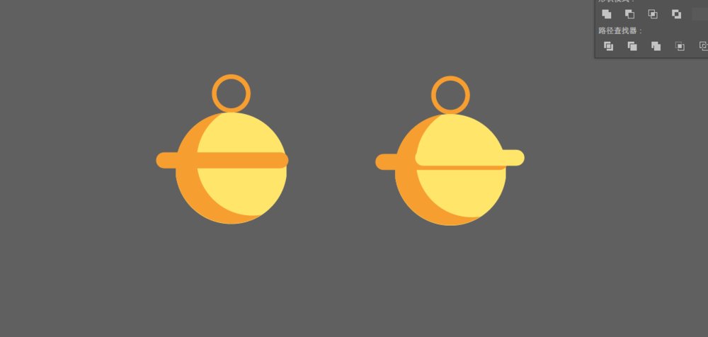 4、复制最开始绘制的那个圆,再画一个小的,如下图排列,这是为了做铃铛的洞,左右各一个,在路径查找器中选择交集