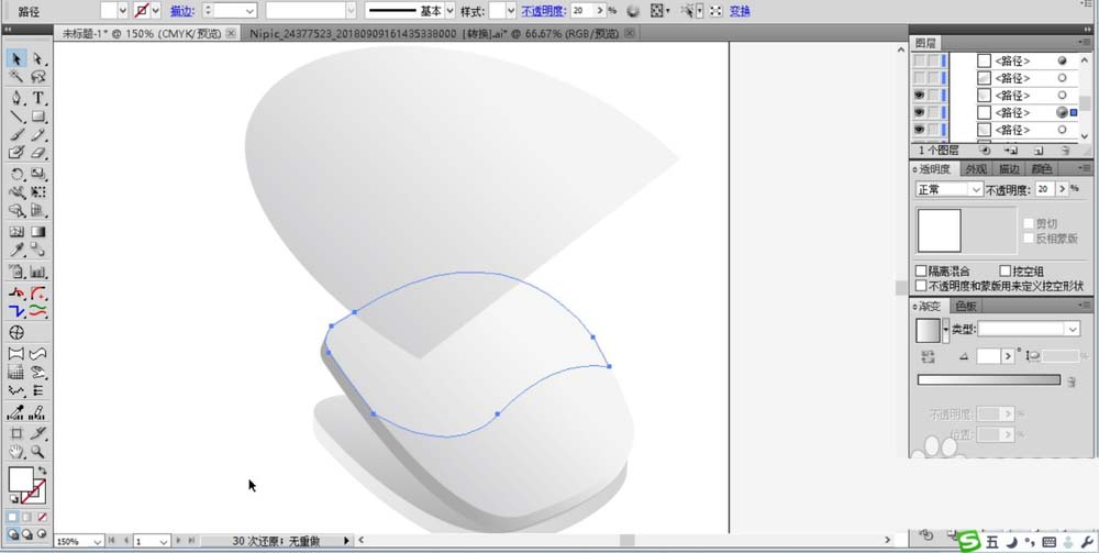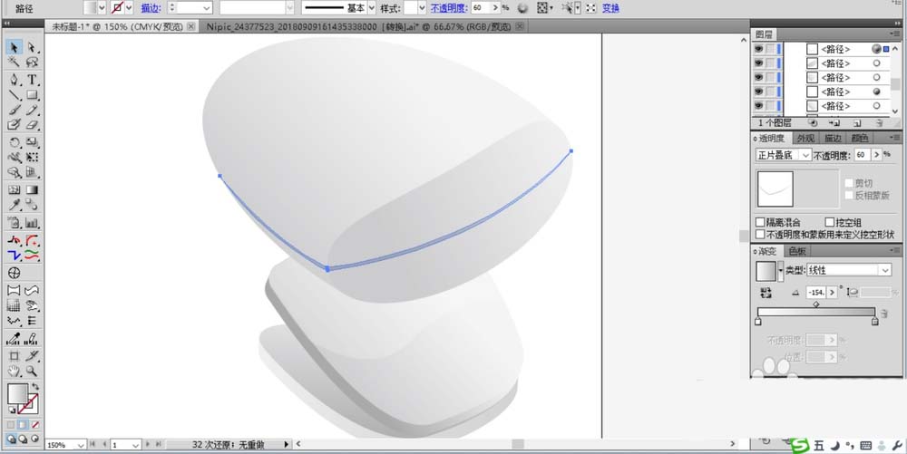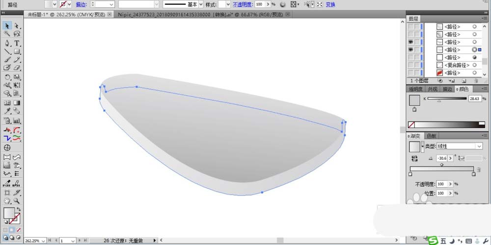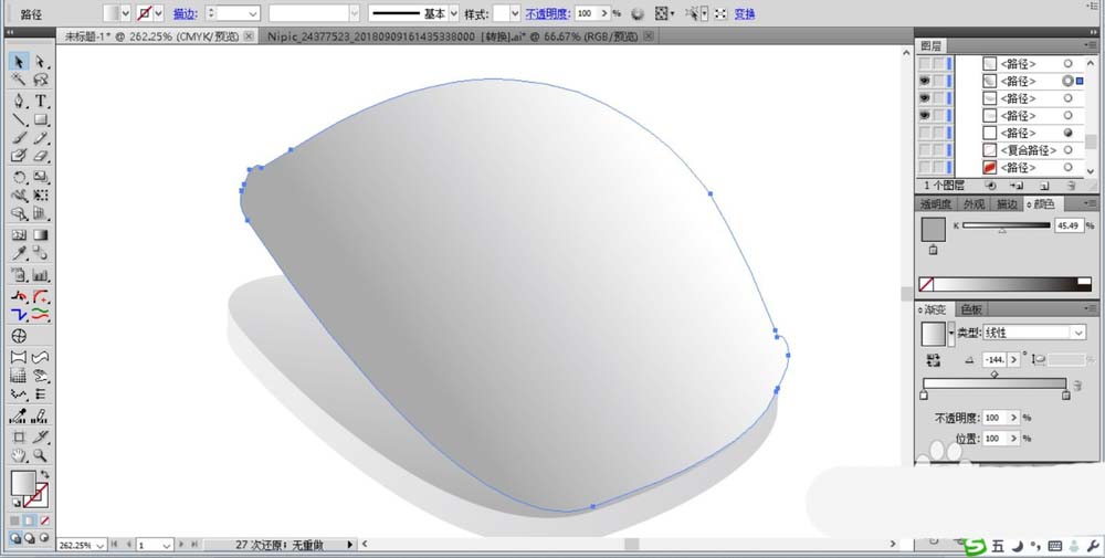 2、接着,我们再来绘制出一个上下部件之间的连接件,我们先勾勒出它的基本轮廓并填充为灰黑色的渐变,注意调整好线性渐变的角度,让其右侧白,左侧黑。
