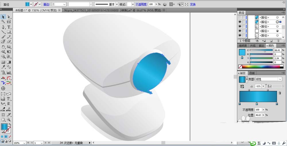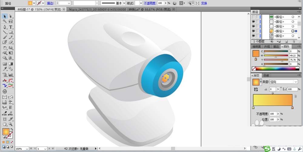 5、这一步开始绘制蓝色的摄像头,用圆形工具绘制出基本的轮廓,再用钢笔修整并填充为三色的蓝色渐变。