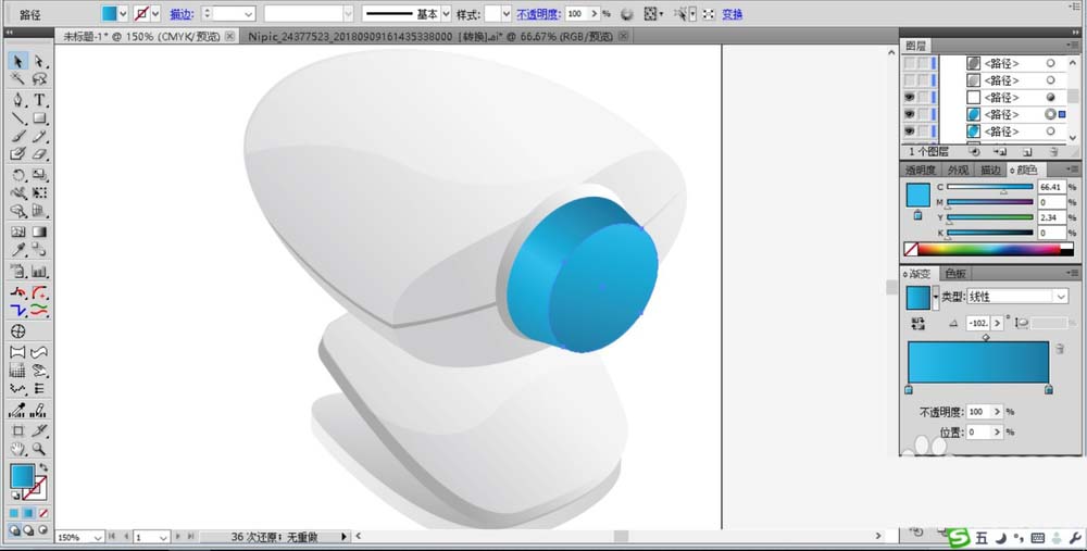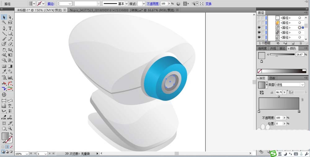 4、我们用两个不同的渐变来填充摄像头的上部零件的正面与侧面,让左侧亮,右侧暗,从而形成一种视觉立体效果。绘制中间的一条深色的连接缝隙,用灰黑色填充并设置成正片叠底。