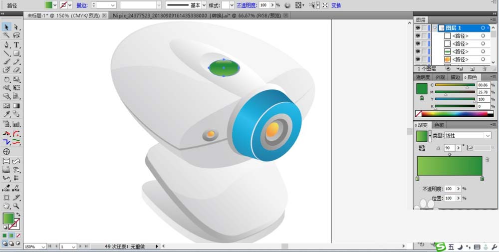 9、绘制摄像头的上部零件上面的小小的绿色结构件的轮廓并用绿色的渐变填充,完成摄像头的侧面的小小结构件绘制,并用灰黑色的渐变填充。
