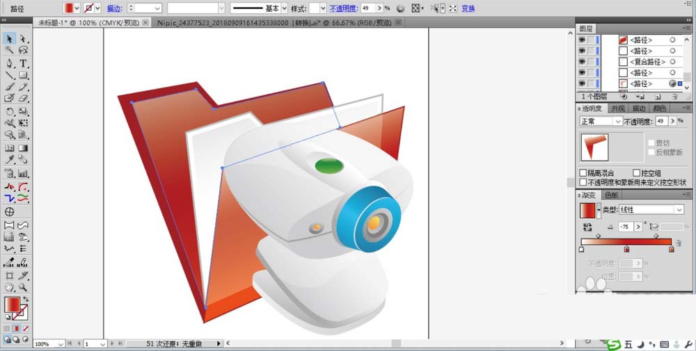 10、在摄像头的左侧画出一个大大的文件夹,它主要分成封皮与内页这样的一个结构层次,我们用半透明的白色渐变来呈现亮区,内页用灰黑色的渐变填充,封皮用红色的渐变填充,完成摄像头图片设计。
