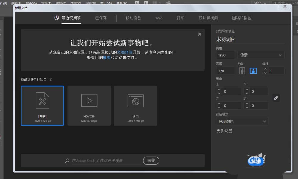 1、新建一个1820*720的文件,颜色模式RGB。