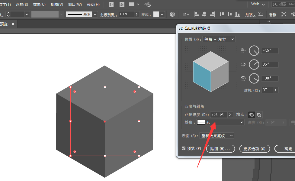 4、新建一个正方形,进行3D凸出和斜角,调整参数。进行贴图处理。
