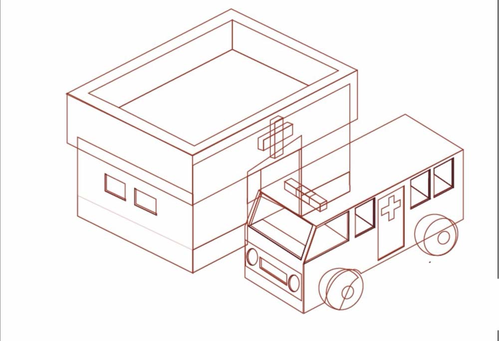 2、继续在医院的右侧画出救护车的基本轮廓,主要元素就是车窗、车灯、车轮等等。