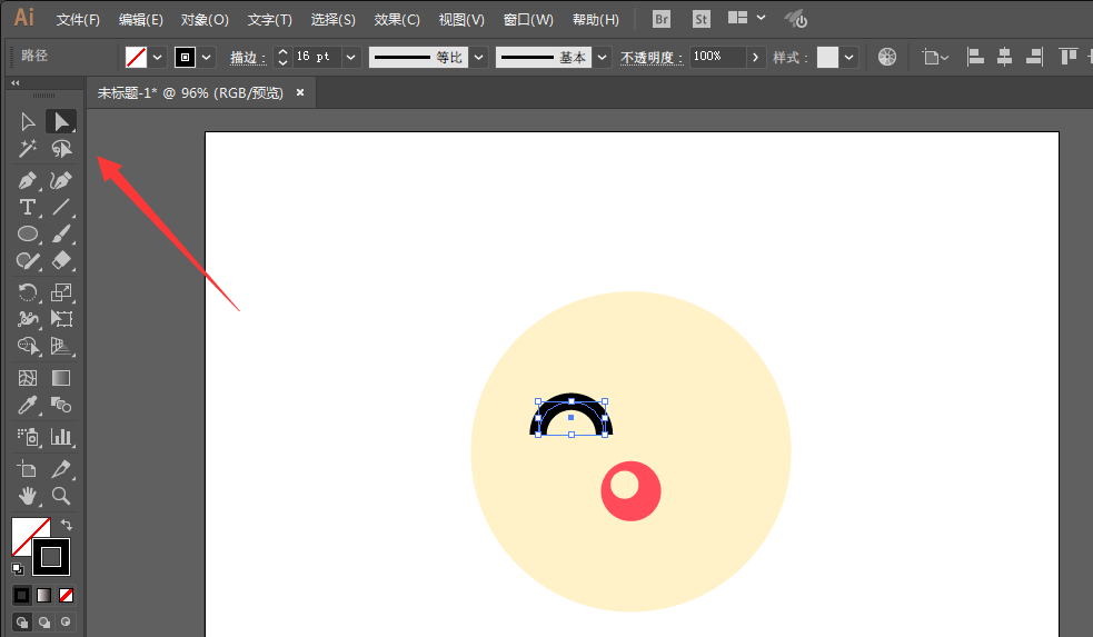 4、继续绘制一个圆形,没有填充,只有描边,加粗描边,然后用直接选择工具去掉一个锚点,复制一个,形成眼睛。