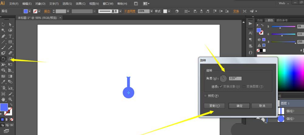 3、绘制一个大圆形,然后调整一下位置,并且把大圆置于底部。旋转复制圆形,度数为120度,再进行一次。