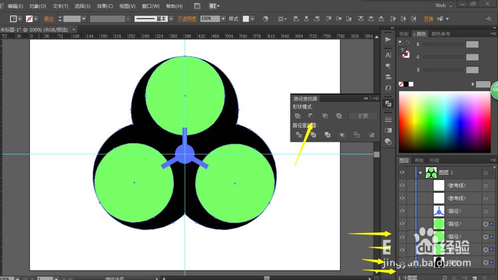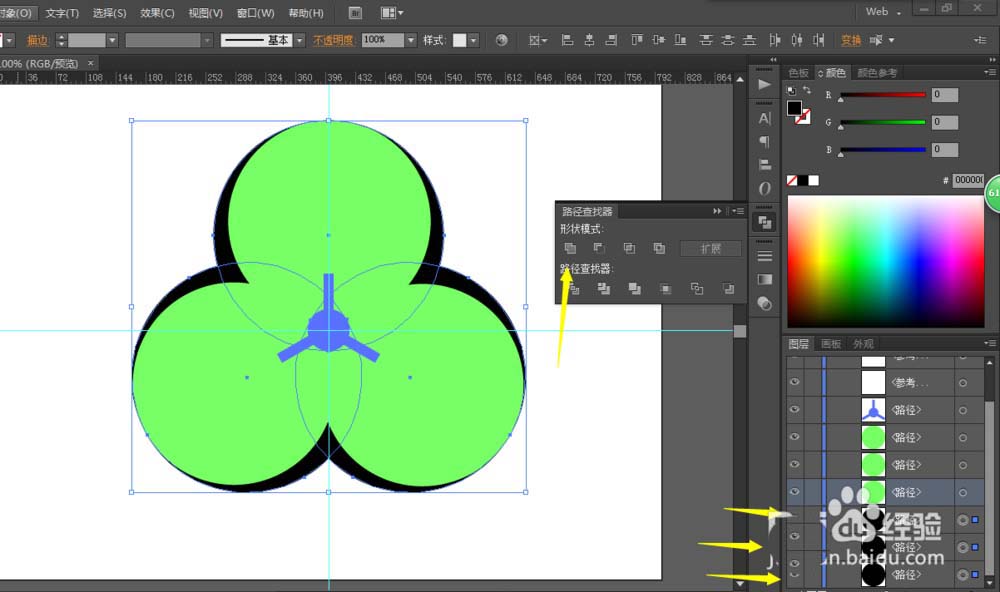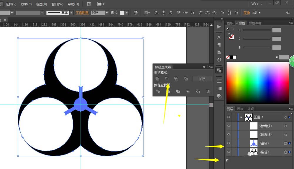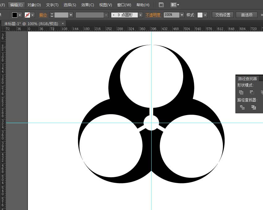 4、绘制一个较小的圆形,同样旋转复制两份,并且联集黑色的圆形。